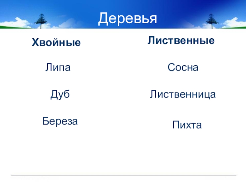 иголочек и называются хвоинками. Большинство хвойных сохраняют иголки в течении всего года, постоянно формируя новые. Вот почему за исключением лиственницы, хвойные всегда зеленые. К таким деревьям относятся ель, сосна, пихта. Семена хвойных деревьев запрятаны в шишках.