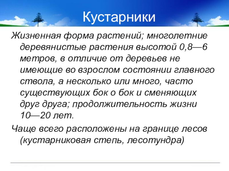Жизненная форма растений; многолетние деревянистые растения высотой 0,8—6 метров, в отличие