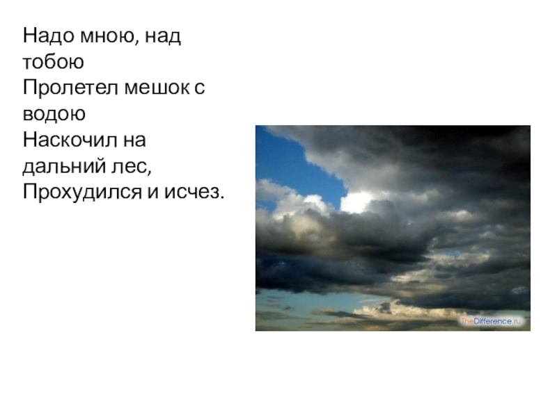 Надо мною, над тобоюПролетел мешок с водоюНаскочил на дальний лес,Прохудился и исчез.