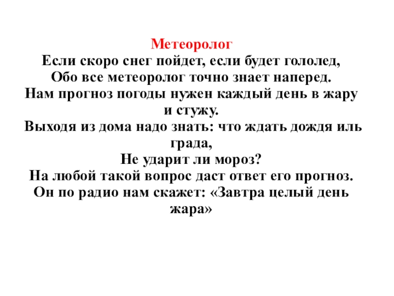 Слайд 3Метеоролог Если скоро снег пойдет, если будет гололед, Обо все метеоролог точно знает
