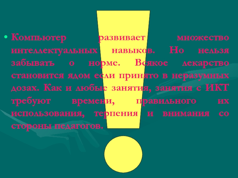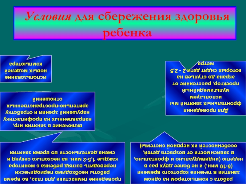 работа с компьютером на одном занятии в течение короткого времени (5-10 мин.) и не более двух раз в неделю (индивидуально и фронтально, в зависимости от возраста детей, особенностей их нервной системы)