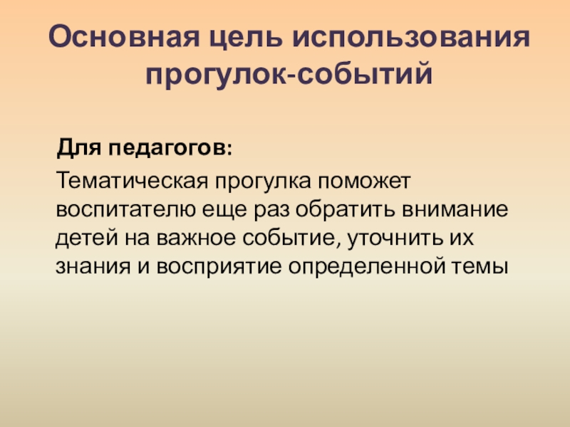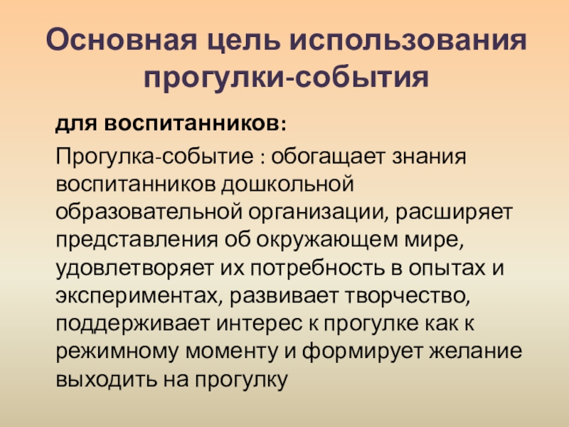 Слайд 9Основная цель использования прогулки-события