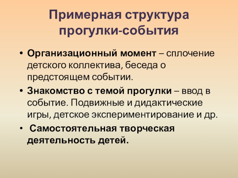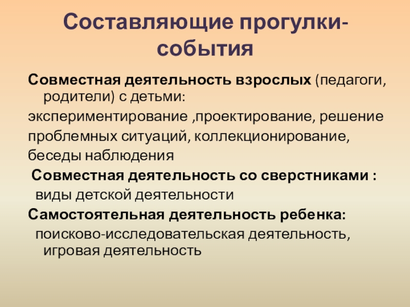Слайд 13Составляющие прогулки- события