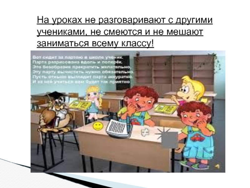 Слайд 5На уроках не разговаривают с другими учениками, не смеются и не