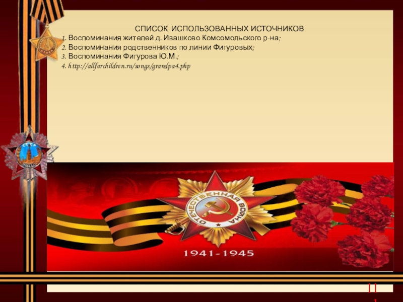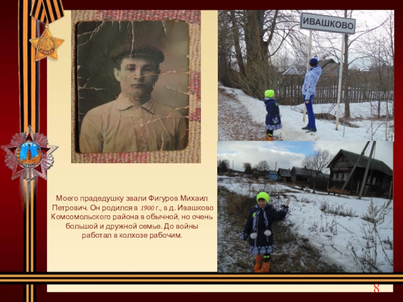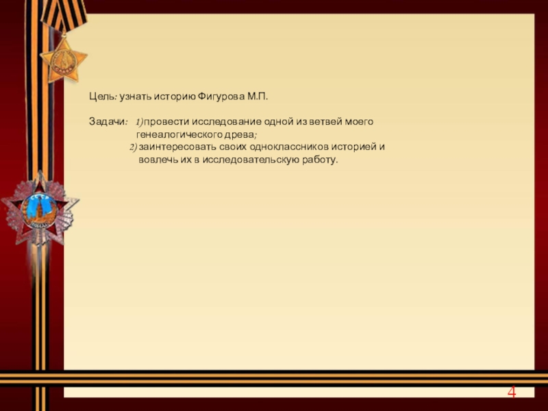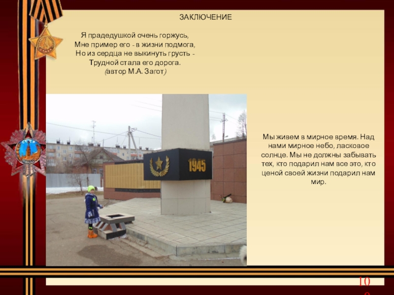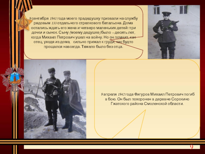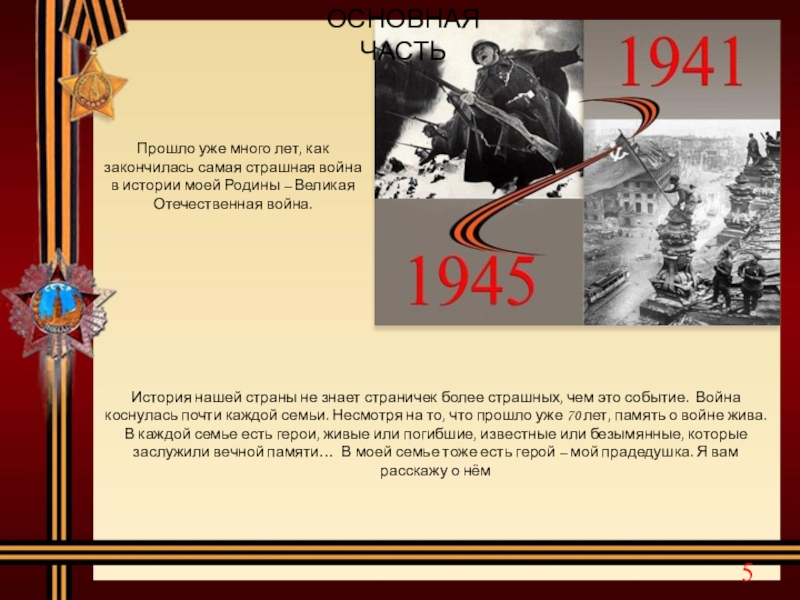 История нашей страны не знает страничек более страшных, чем это событие. Война коснулась почти каждой семьи. Несмотря на то, что прошло уже 70 лет, память о войне жива. В каждой семье есть герои, живые или погибшие, известные или безымянные, которые заслужили вечной памяти… В моей семье тоже есть герой – мой прадедушка. Я вам расскажу о нём