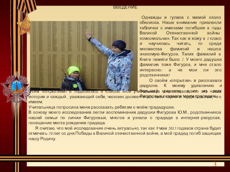 Однажды я гуляла с мамой около обелиска. Наше внимание привлекли таблички с именами погибших в годы Великой Отечественной войны комсомольчан. Так как я хожу в 1 класс и научилась читать, то среди множества фамилий я нашла знакомую-Фигуров. Таких фамилий в Книге памяти было 7. У моего дедушки фамилия тоже Фигуров, и мне стало интересно: а не мои ли это родственники?