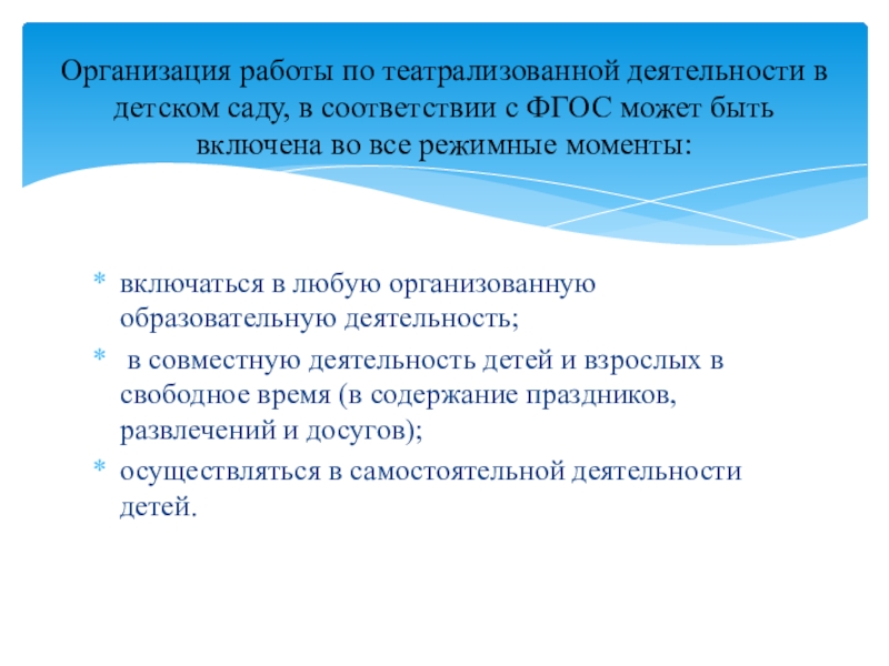 Организация работы по театрализованной деятельности в детском саду, в соответствии с ФГОС может быть включена во все режимные моменты: