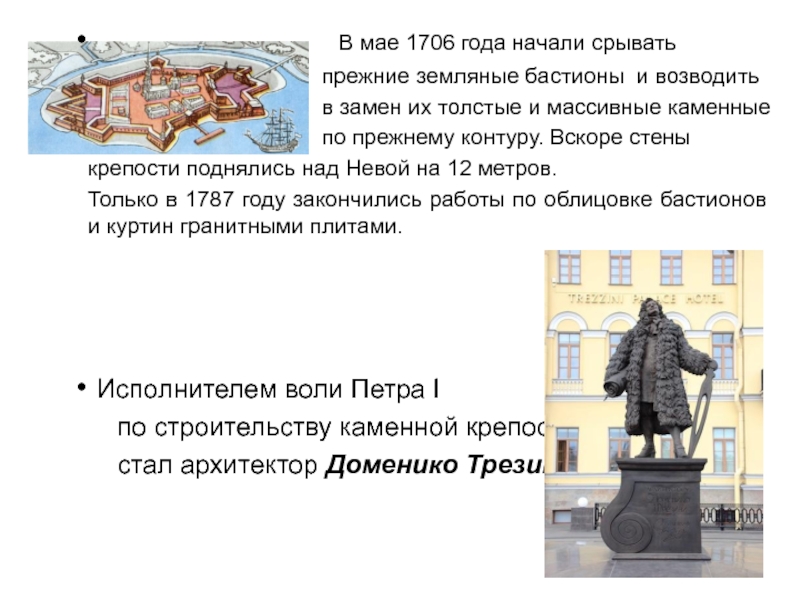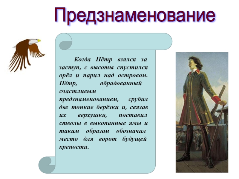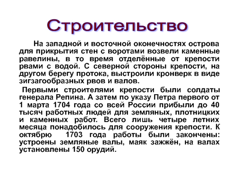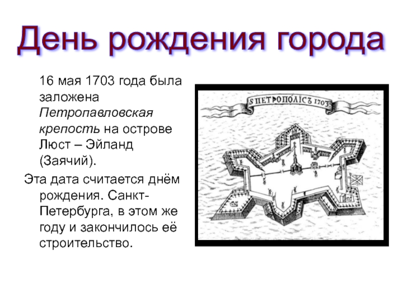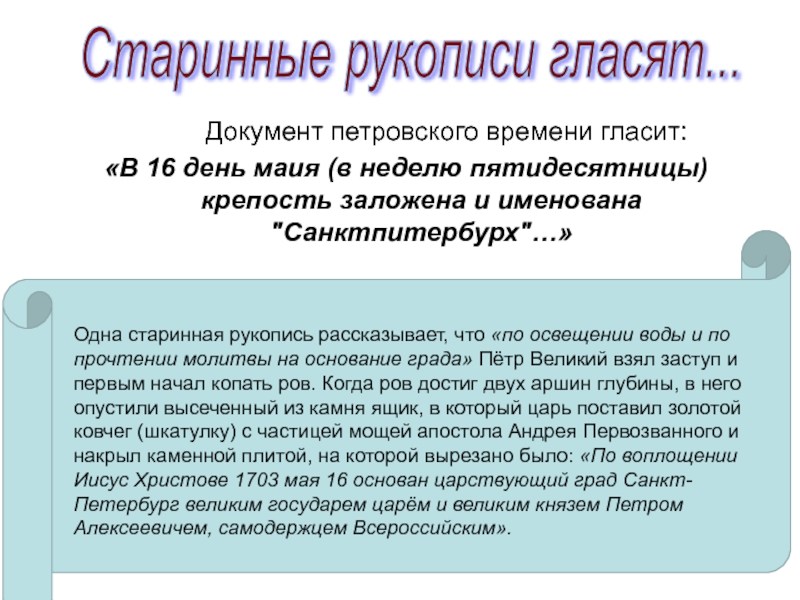 Одна старинная рукопись рассказывает, что «по освещении воды и по прочтении молитвы на основание града» Пётр Великий взял заступ и первым начал копать ров. Когда ров достиг двух аршин глубины, в него опустили высеченный из камня ящик, в который царь поставил золотой ковчег (шкатулку) с частицей мощей апостола Андрея Первозванного и накрыл каменной плитой, на которой вырезано было: «По воплощении Иисус Христове 1703 мая 16 основан царствующий град Санкт-Петербург великим государем царём и великим князем Петром Алексеевичем, самодержцем Всероссийским».