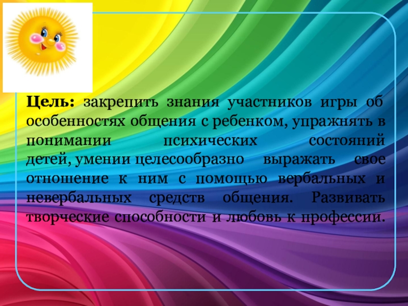 Цель: закрепить знания участников игры об особенностях общения с ребенком, упражнять в понимании психических состояний детей, умении целесообразно выражать свое отношение к ним с помощью вербальных и невербальных средств общения. Развивать творческие способности и любовь к