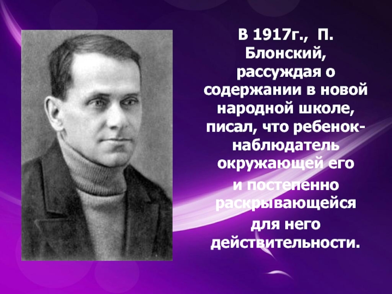 Слайд 6В 1917г., П.Блонский, рассуждая о содержании в новой народной школе, писал,