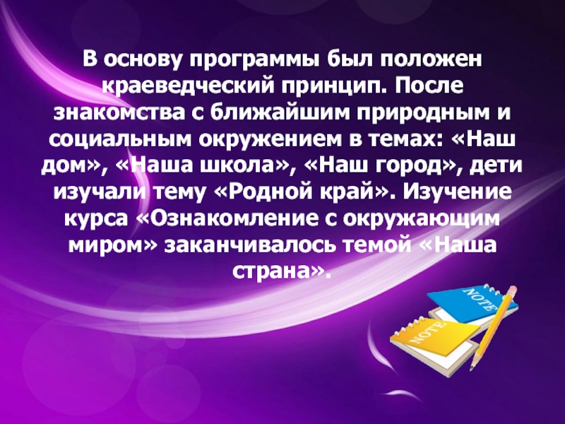 Слайд 15В основу программы был положен краеведческий принцип. После знакомства с ближайшим