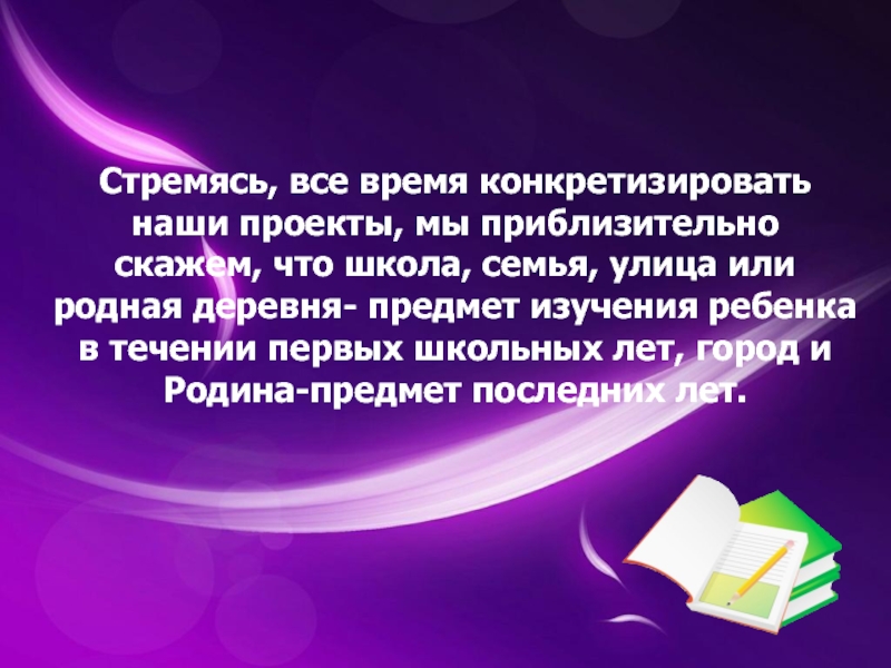 семья, улица или родная деревня- предмет изучения ребенка в течении первых школьных лет, город и Родина-предмет последних лет.