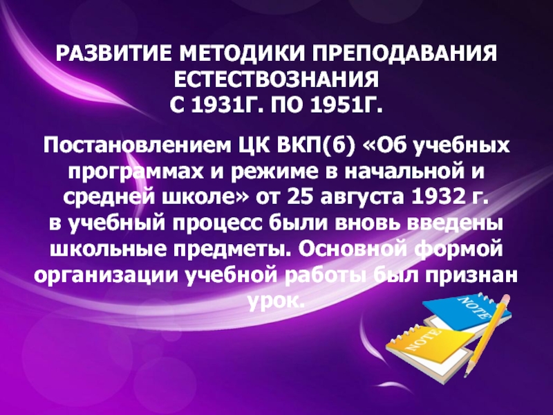 учебных программах и режиме в начальной и средней школе» от 25 августа 1932 г. в учебный процесс были вновь введены школьные предметы. Основной формой организации учебной работы был признан урок.