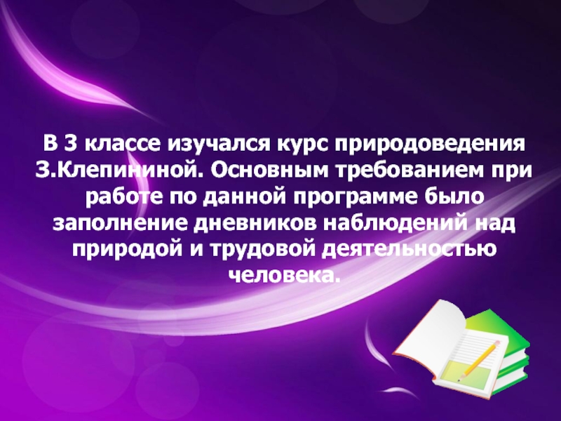 Слайд 16В 3 классе изучался курс природоведения З.Клепининой. Основным требованием при работе