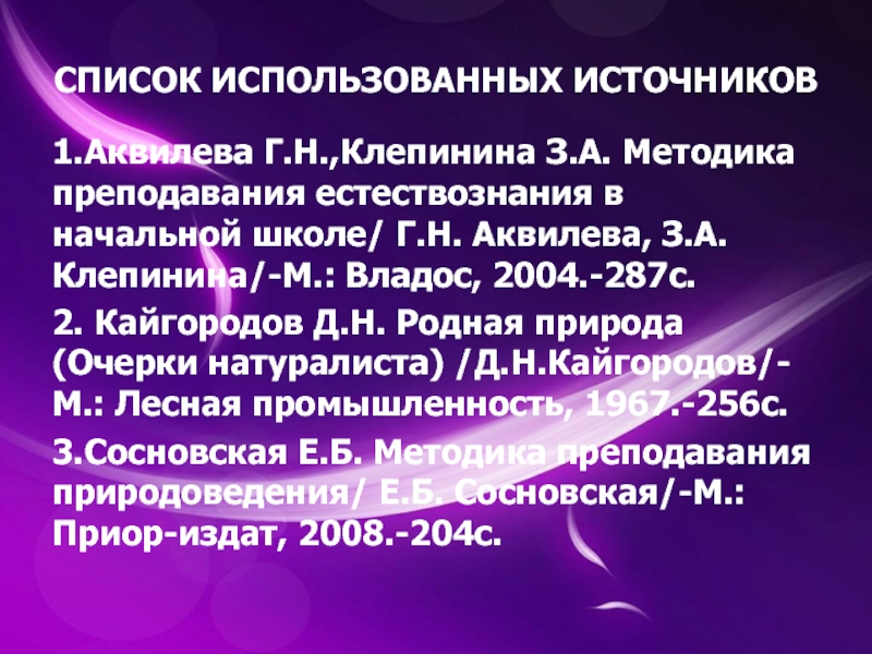 1.Аквилева Г.Н.,Клепинина З.А. Методика преподавания естествознания в начальной школе/