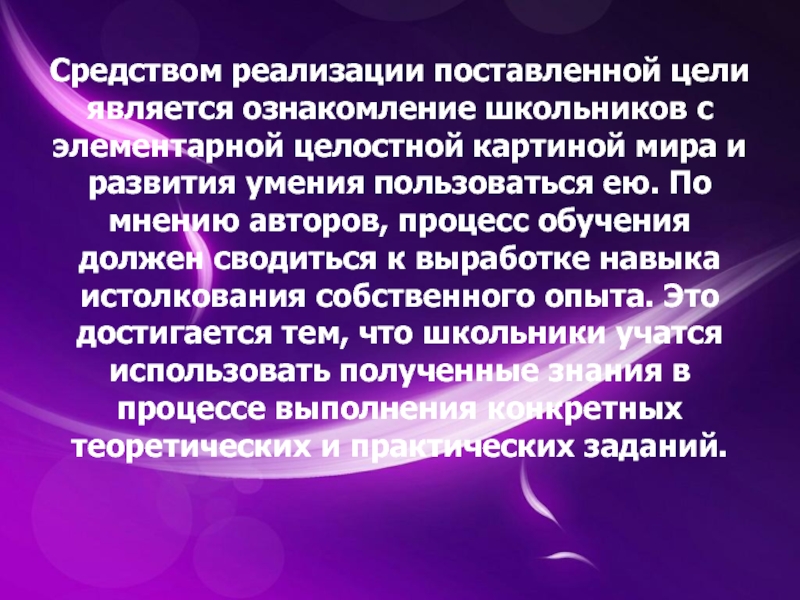 Слайд 24Средством реализации поставленной цели является ознакомление школьников с элементарной целостной картиной