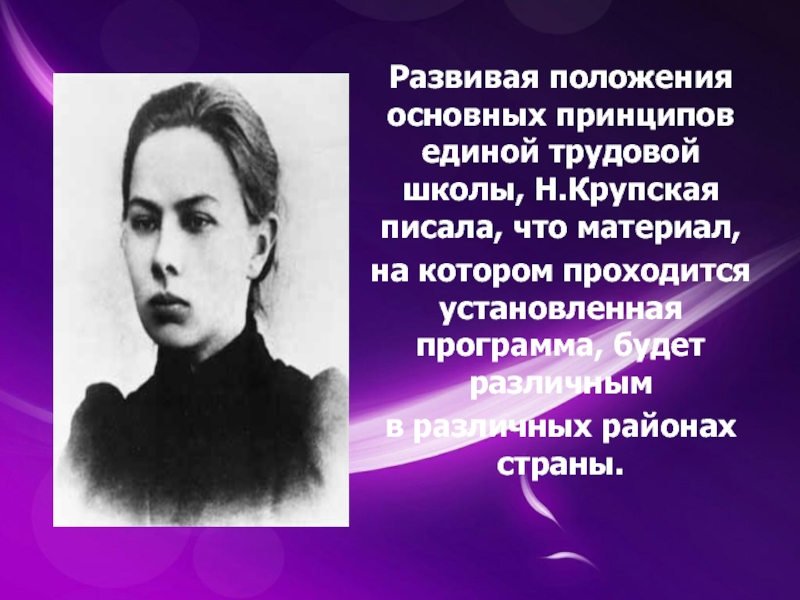 Слайд 8Развивая положения основных принципов единой трудовой школы, Н.Крупская писала, что материал,