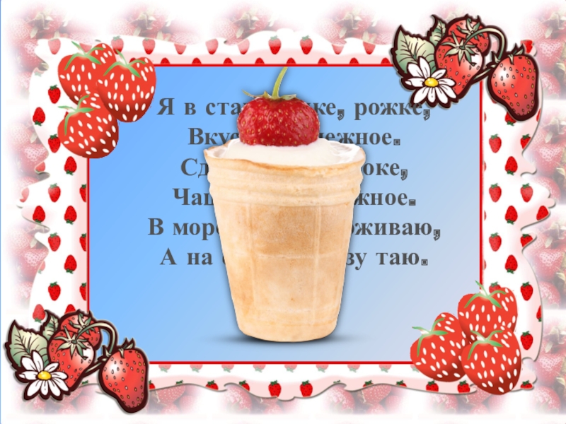 Я в стаканчике, рожке,Вкусное и нежное.Сделано на молоке,Чаще – белоснежное.В морозилках проживаю,А на солнце сразу таю.