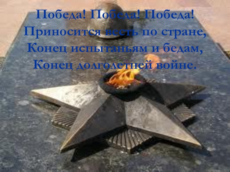 Слайд 23Победа! Победа! Победа! Приносится весть по стране, Конец испытаньям и бедам, Конец долголетней