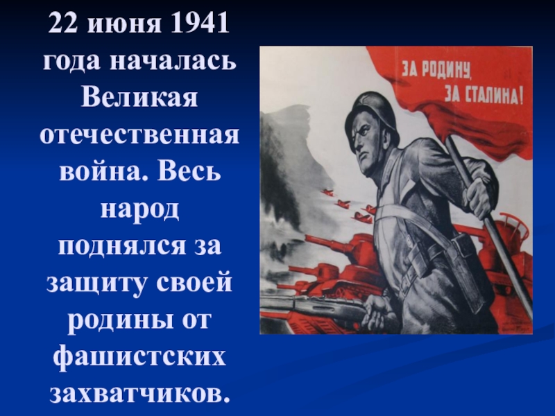 22 июня 1941 года началась Великая отечественная война. Весь народ поднялся за защиту своей родины от фашистских