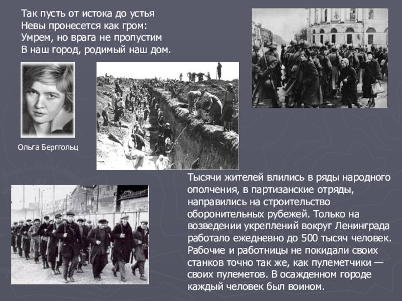 Тысячи жителей влились в ряды народного ополчения, в партизанские отряды, направились на строительство оборонительных рубежей. Только на возведении укреплений вокруг Ленинграда работало ежедневно до 500 тысяч человек. Рабочие и работницы не покидали своих станков точно так же, как пулеметчики — своих пулеметов. В осажденном городе каждый человек был воином.