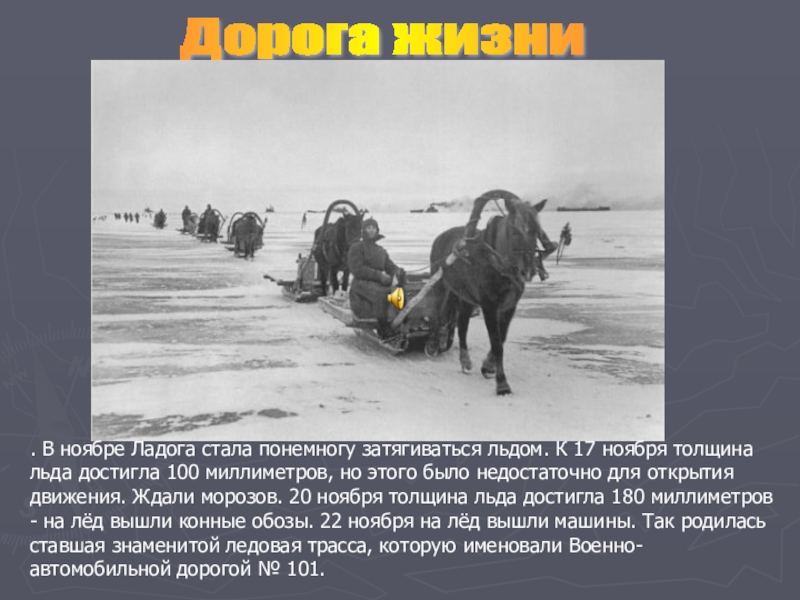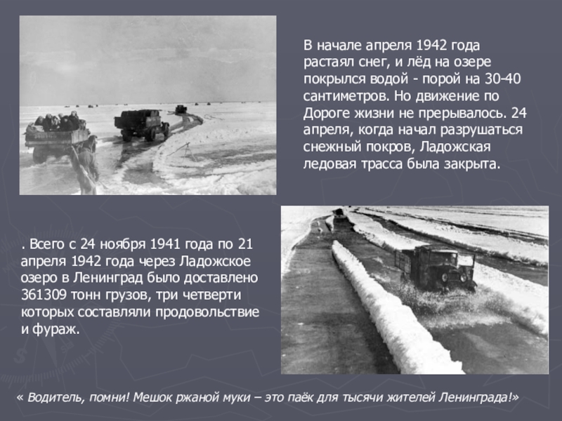 В начале апреля 1942 года растаял снег, и лёд на озере покрылся водой - порой на 30-40 сантиметров. Но движение по Дороге жизни не прерывалось. 24 апреля, когда начал разрушаться снежный покров, Ладожская ледовая трасса была закрыта.