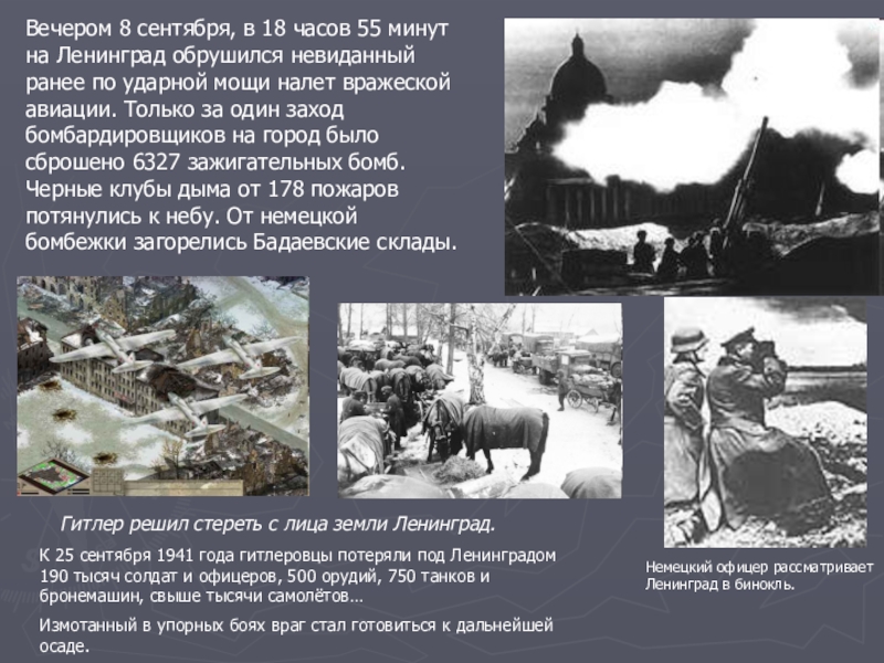 К 25 сентября 1941 года гитлеровцы потеряли под Ленинградом 190 тысяч солдат и офицеров, 500 орудий, 750 танков и бронемашин, свыше тысячи самолётов…