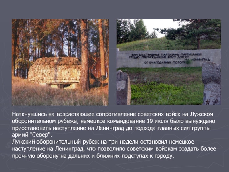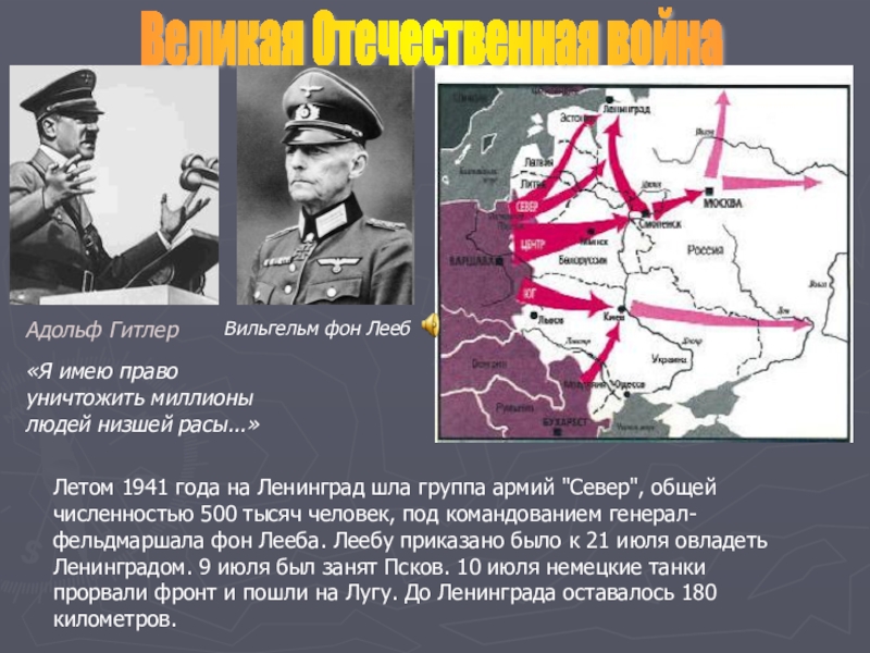 Летом 1941 года на Ленинград шла группа армий "Север", общей численностью 500 тысяч человек, под командованием генерал-фельдмаршала фон Лееба. Леебу приказано было к 21 июля овладеть Ленинградом. 9 июля был занят Псков. 10 июля немецкие танки прорвали фронт и пошли на Лугу. До Ленинграда оставалось 180 километров.