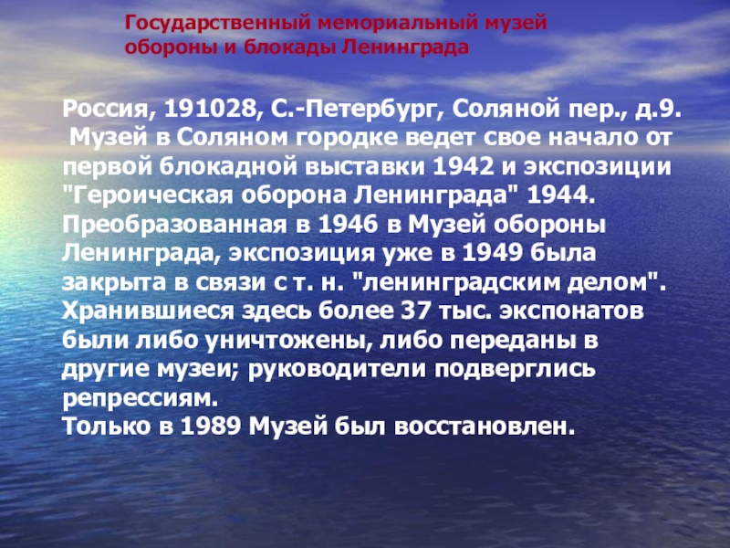 На момент установления блокады в городе находилось 2 миллиона 544 тысячи человек, в том числе около 400 тысяч детей. Кроме того, в пригородных районах, то есть тоже в кольце блокады, осталось 343 тысячи человек. В сентябре, когда начались систематические бомбардировки, обстрелы и пожары, многие хотели выехать, но пути уже были отрезаны.