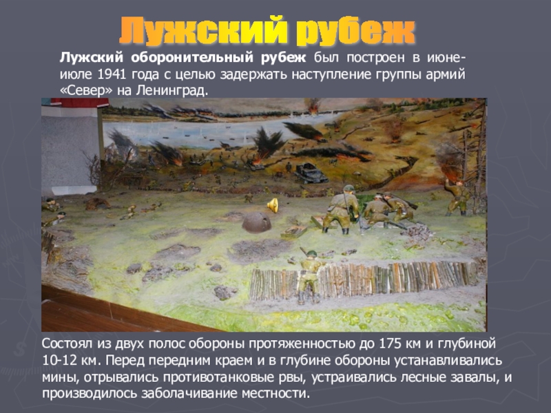 Состоял из двух полос обороны протяженностью до 175 км и глубиной 10-12 км. Перед передним краем и в глубине обороны устанавливались мины, отрывались противотанковые рвы, устраивались лесные завалы, и производилось заболачивание местности.
