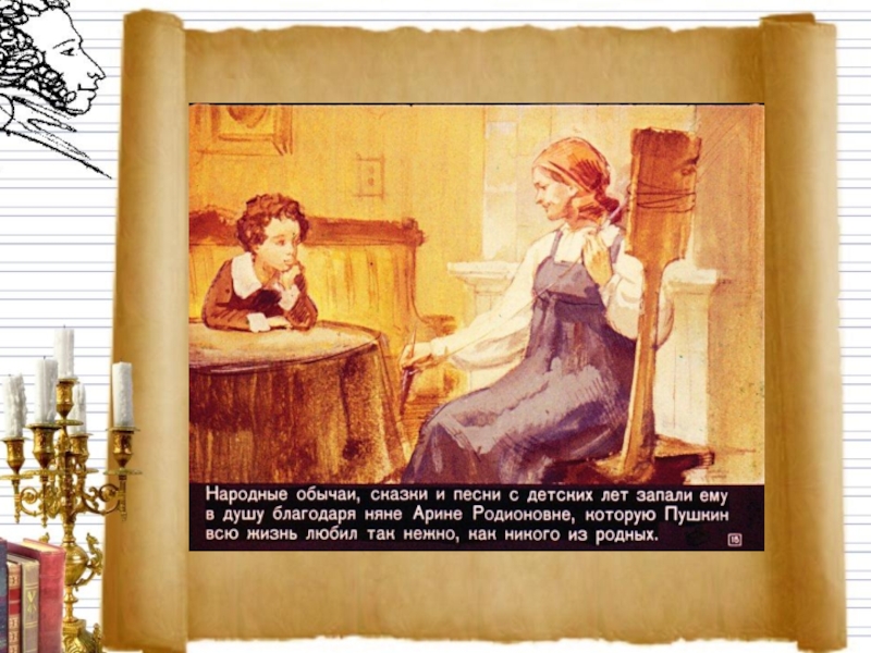 Арина Родионовна первая познакомила Пушкина с русскими сказками. Многие рассказы он записывал, а потом использовал в своих сказках.
