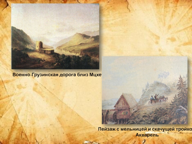 Военно-Грузинская дорога близ МцхетаПейзаж с мельницей и скачущей тройкой. Акварель