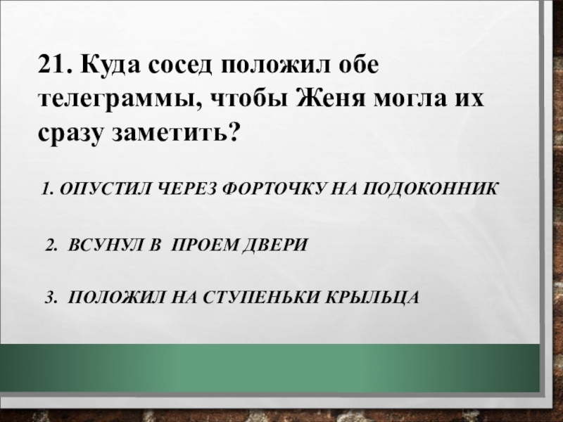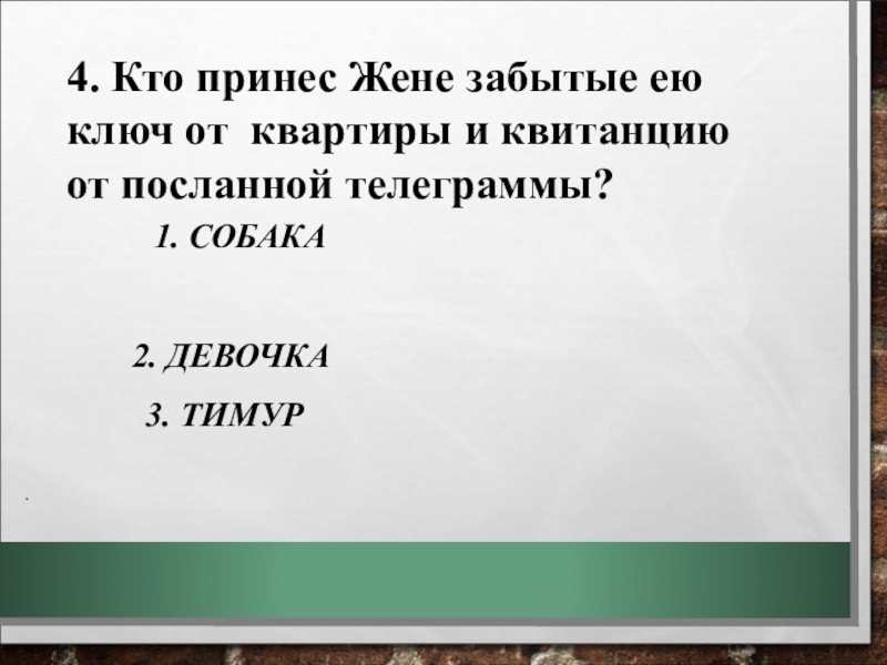 4. Кто принес Жене забытые ею ключ от квартиры и квитанцию от посланной телеграммы?