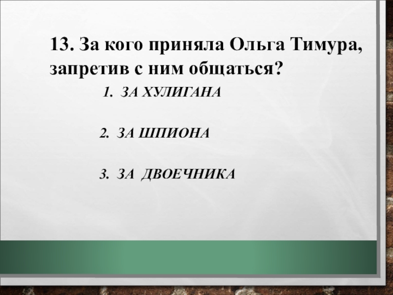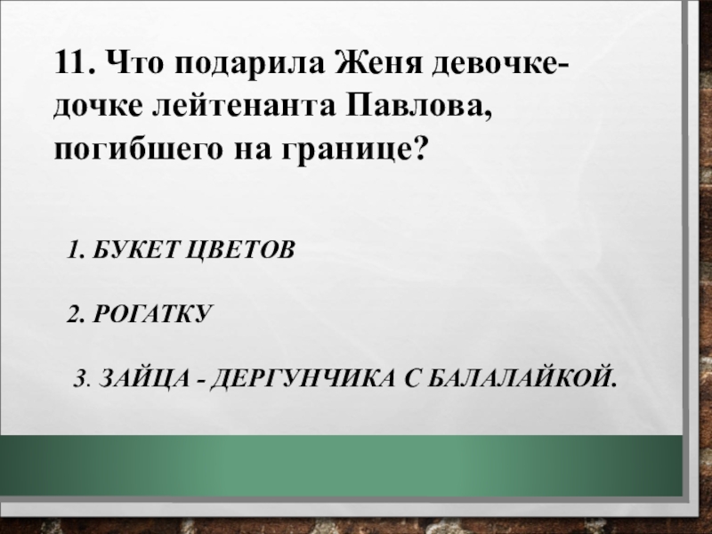 11. Что подарила Женя девочке- дочке лейтенанта Павлова, погибшего на границе?