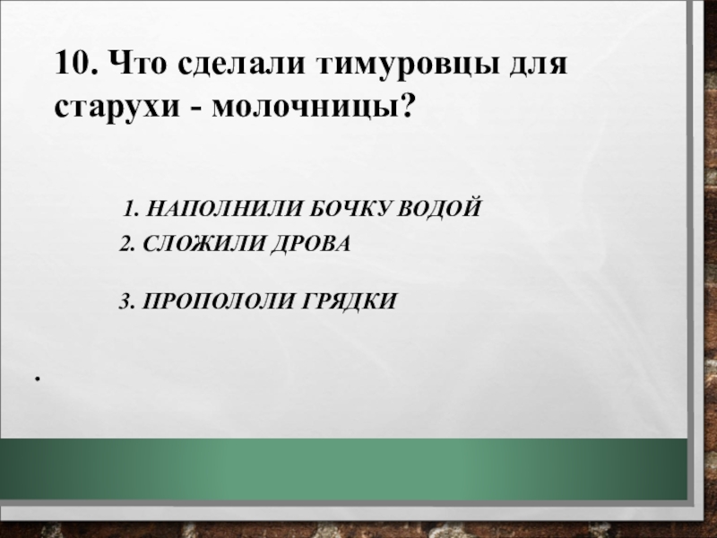 10. Что сделали тимуровцы для старухи - молочницы?