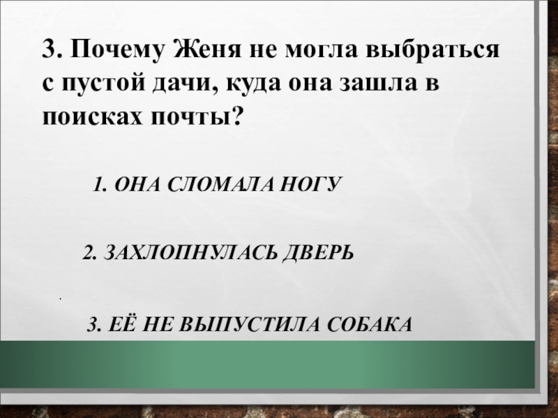 3. ЕЁ НЕ ВЫПУСТИЛА СОБАКА