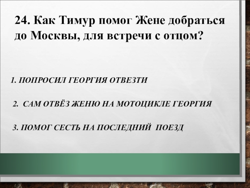 24. Как Тимур помог Жене добраться до Москвы, для встречи с отцом?
