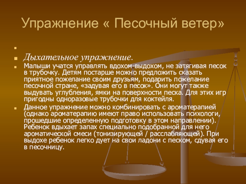 Данное упражнение можно комбинировать с ароматерапией (однако ароматерапию имеют право использовать психологи, прошедшие определенную подготовку в этом направлении). Ребенок вдыхает запах специально подобранной для него ароматической смеси (тонизирующей / расслабляющей). При выдохе ребенок легко дует на свои ладони с песком, сдувая его в песочницу.