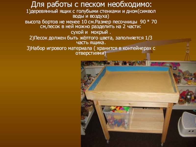 2)Песок должен быть жёлтого цвета, заполняется 1/3 часть ящика.