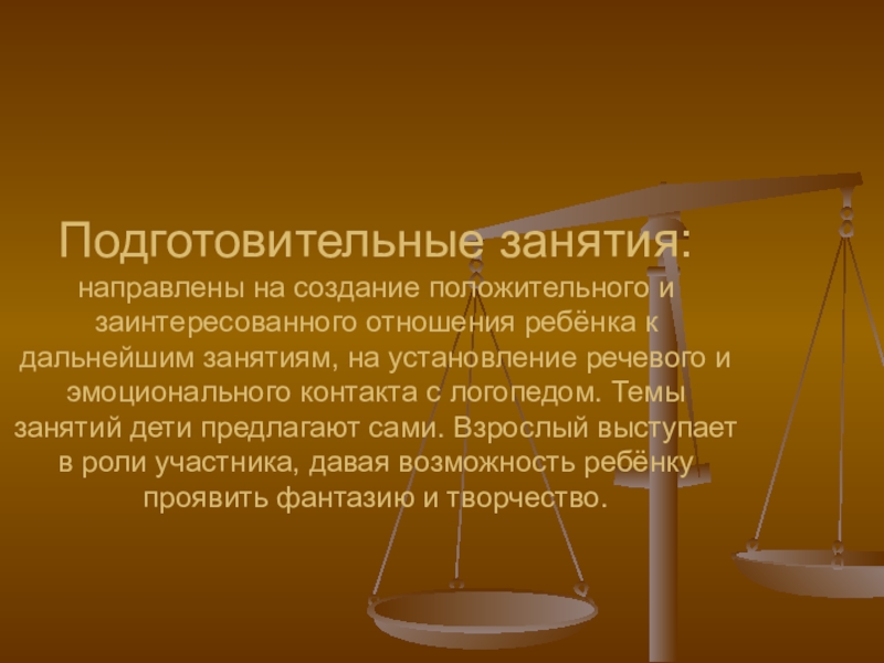занятиям, на установление речевого и эмоционального контакта с логопедом. Темы занятий дети предлагают сами. Взрослый выступает в роли участника, давая возможность ребёнку проявить фантазию и творчество.