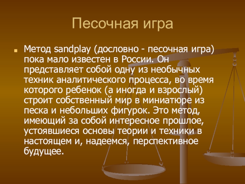 России. Он представляет собой одну из необычных техник аналитического процесса, во время которого ребенок (а иногда и взрослый) строит собственный мир в миниатюре из песка и небольших фигурок. Это метод, имеющий за собой интересное прошлое, устоявшиеся основы теории и техники в настоящем и, надеемся, перспективное будущее.