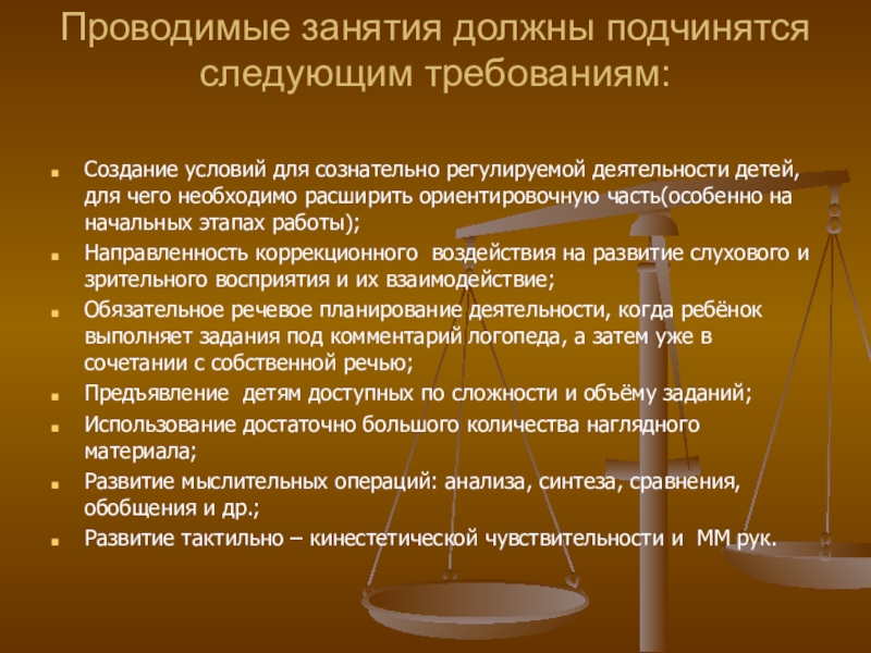 Слайд 5Проводимые занятия должны подчинятся следующим требованиям: