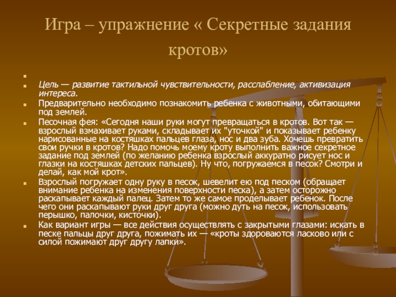 Как вариант игры — все действия осуществлять с закрытыми глазами: искать в песке пальцы друг друга, пожимать их — «кроты здороваются ласково или с силой пожимают друг другу лапки».