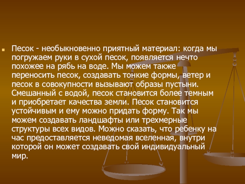 Слайд 4Песок - необыкновенно приятный материал: когда мы погружаем руки в сухой