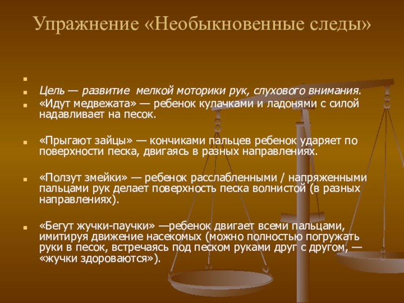 «Бегут жучки-паучки» —ребенок двигает всеми пальцами, имитируя движение насекомых (можно полностью погружать руки в песок, встречаясь под песком руками друг с другом, — «жучки здороваются»).