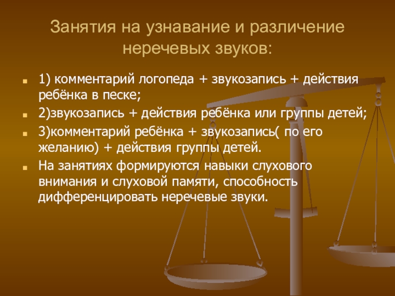 Слайд 7Занятия на узнавание и различение неречевых звуков:
