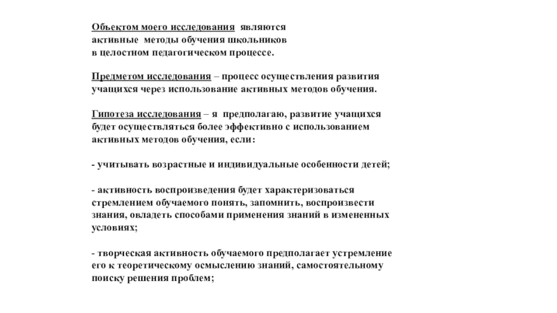 Гипотеза исследования – я предполагаю, развитие учащихся будет осуществляться более эффективно с использованием активных методов обучения, если: