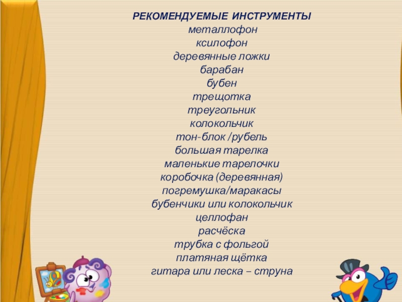 1. Определите, какие музыкальные или шумовые инструменты и предметы, а
