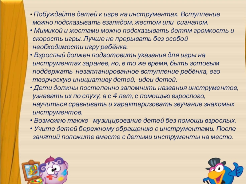 Взрослый должен подготовить указания для игры на инструментах заранее, но, в то же время, быть готовым поддержать незапланированное вступление ребёнка, его творческую инициативу детей, идеи детей.
