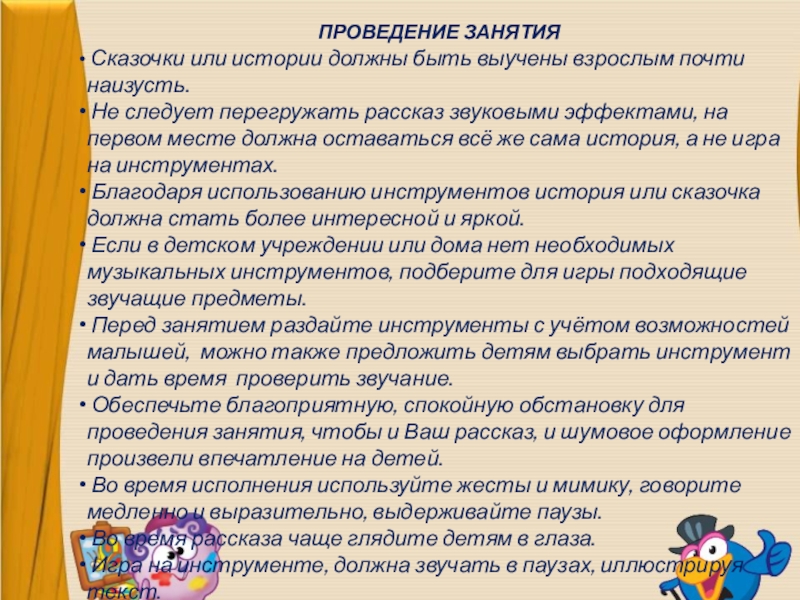 Обеспечьте благоприятную, спокойную обстановку для проведения занятия, чтобы и Ваш рассказ, и шумовое оформление произвели впечатление на детей.